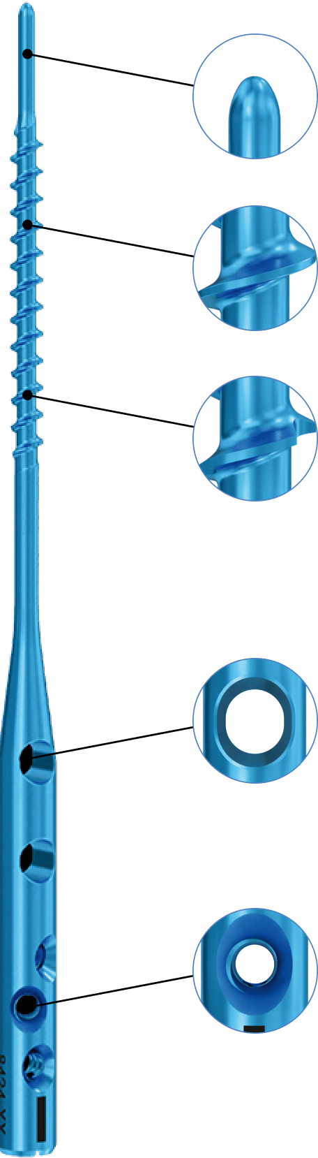 Self-cutting and self-tapping flutes require no pre-tapping, decreasing procedure time.